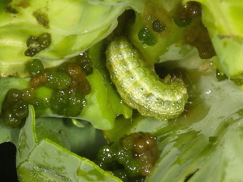 1356 Garden Pebble (Evergestis forficalis) caterpillar feeding in heart of cabbage