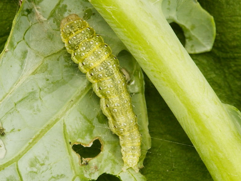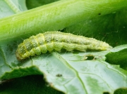 1356 Garden Pebble (Evergestis forficalis) third instar caterpillar feeding on a cabbage leaf