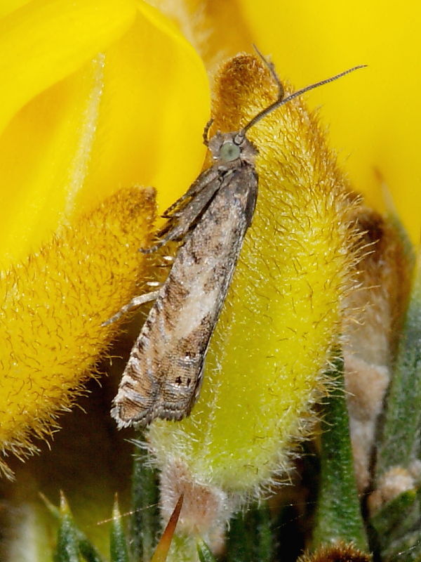 Insight: Cydia ulicetana is common on moorland and heathland in much of the UK. A tiny moth with a wingspan of 12-16mm its larvae feed on the seedpods of plant species such as Gorse (Ulex europaeus) and Broom (Cytisus scoparius).