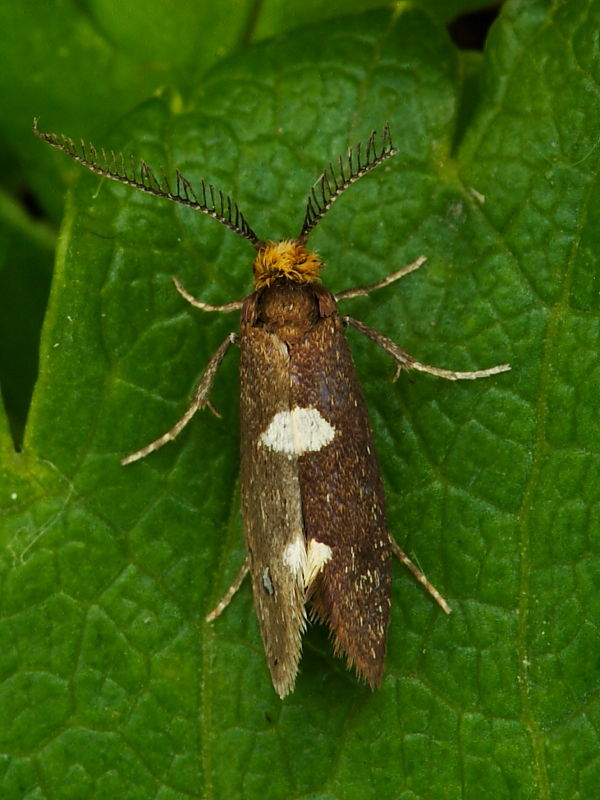 Incurvaria masculella says it all. The trouble you take to first find your tiny creature, then get it to behave and finally get the camera to perform, only to find once the images are on screen that the subject is a poor specimen, in this case a broken antenna. This moth is little more than 5mm in length and the males are unusual for such a tiny moth in having comb-like antennae. They are even more unusual when they only have half of one!