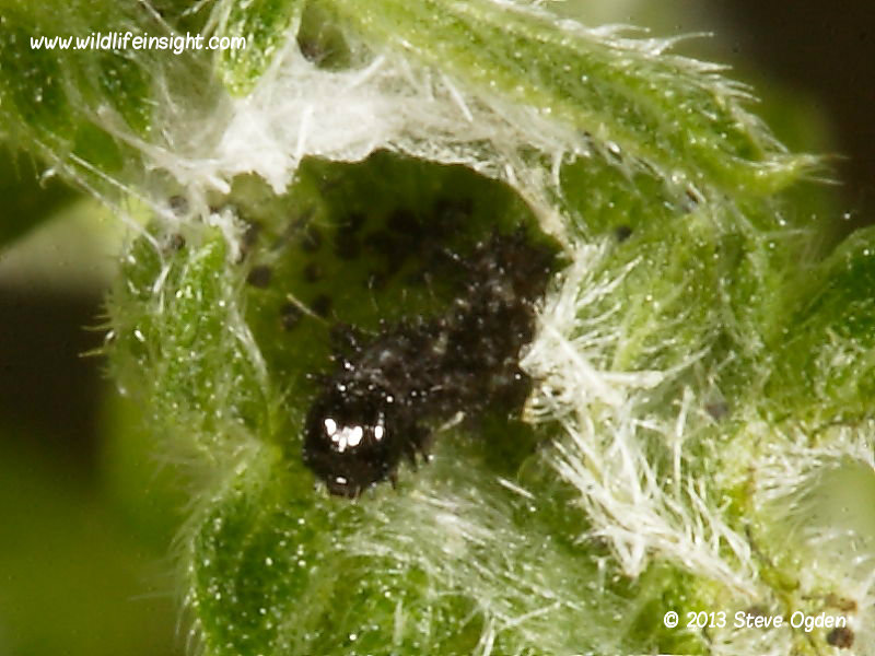 Pupation most frequently occurs within its final leaf wrap – the chrysalis shown right has had its leaf ‘tent’ removed.