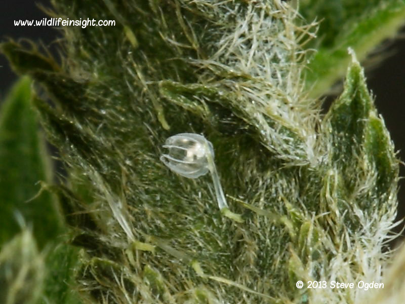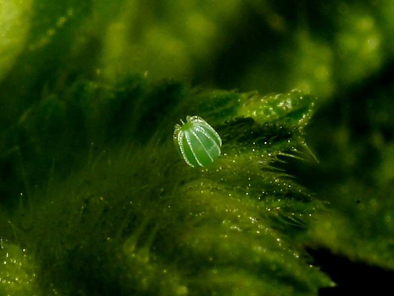 The females lay single green eggs on the upper side of the leaves of the larval foodplants – Common Nettle, Small Nettle, Pellitory-of-the-wall and Hop.
